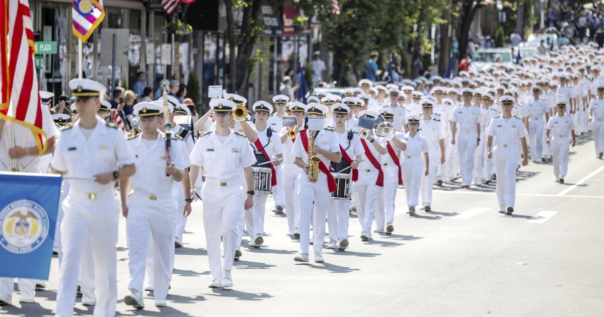 Midshipmen from the Kings Point Merchant Marine Academy march during the Great Neck Memorial Day Parade, in Great Neck, New York, on May 29th, 2023. Howard Schnapp / Newsday RM / Getty Images