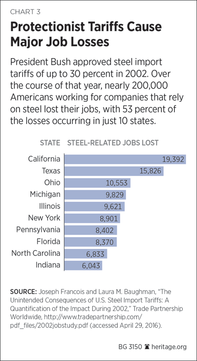 As demonstrated in the previous examples, using tariffs to protect one industry can have severe consequences on other parts of the domestic economy. To put this impact in perspective: The U.S. steel industry employed approximately 147,000 people in 2015; yet scores of other domestic companies need the steel produced by these individuals to create finished goods. In fact, steel-consuming manufacturers employ about 6.5 million people each year, and the construction industry supports another 6.3 million jobs.[27]