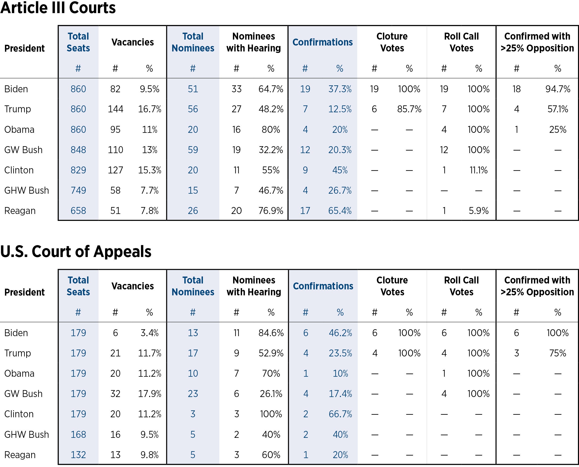 Following and evaluating the judicial appointment process requires reliable, accurate, and current information. The Judicial Appointment Tracker provides current data on six components of the process: judicial vacancies, nominations, hearings, confirmations, votes to end debate, and roll call votes. The Judicial Appointment Tracker will be regularly updated to provide the current data in each category for President Trump and comparison data at the same point under previous presidents. Sources for the data used in the Judicial Appointment Tracker include the Administrative Office of the U.S. Courts, Federal Judicial Center, Senate Judiciary Committee, and Congress.gov.