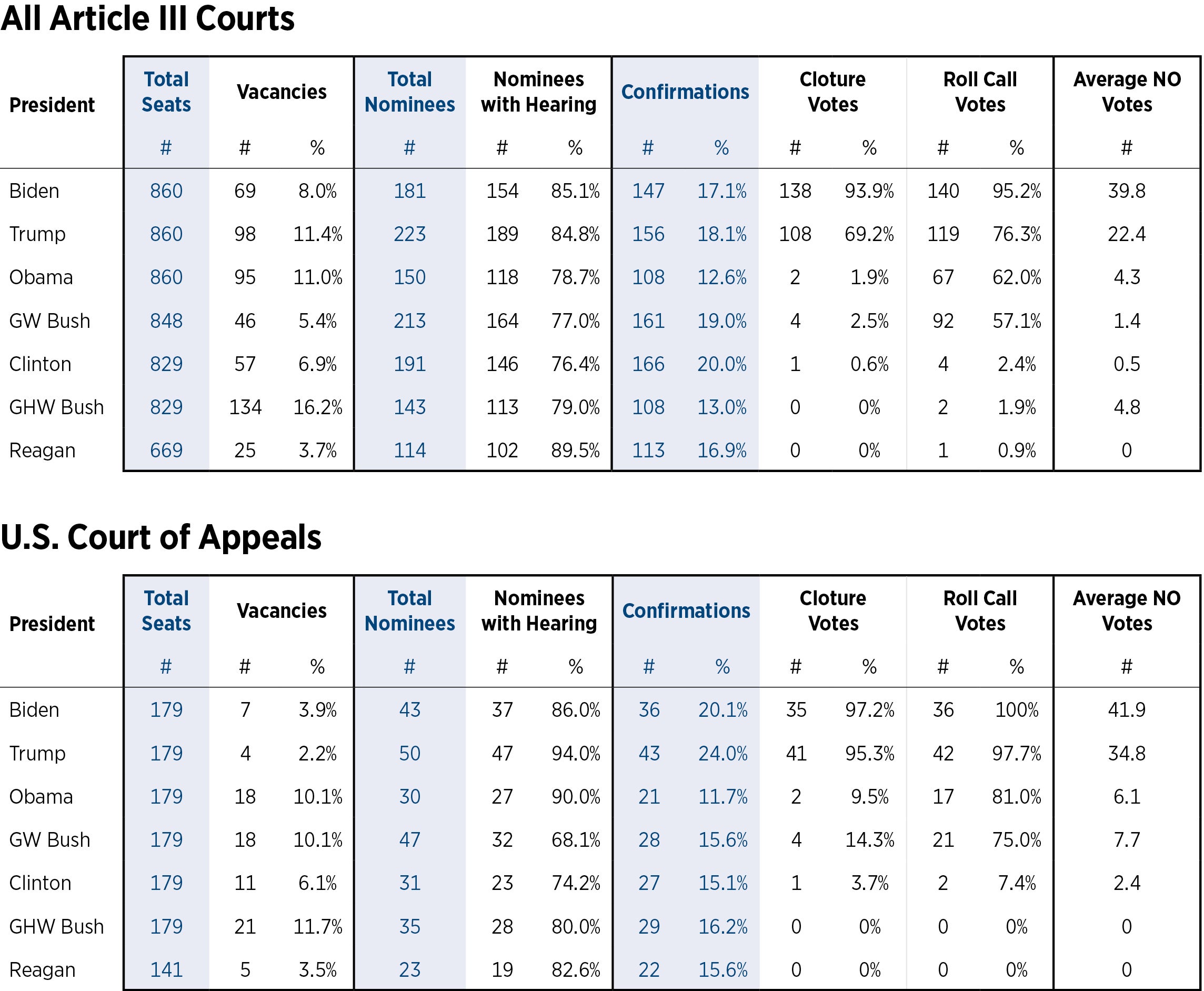 Following and evaluating the judicial appointment process requires reliable, accurate, and current information. The Judicial Appointment Tracker provides current data on six components of the process: judicial vacancies, nominations, hearings, confirmations, votes to end debate, and roll call votes. The Judicial Appointment Tracker will be regularly updated to provide the current data in each category for President Biden and comparison data at the same point under previous presidents. Sources for the data used in the Judicial Appointment Tracker include the Administrative Office of the U.S. Courts, Federal Judicial Center, Senate Judiciary Committee, and Congress.gov.