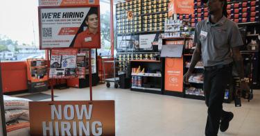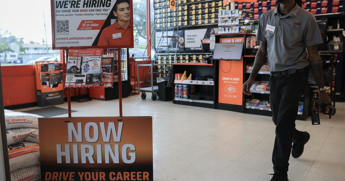 A "Now Hiring" sign is seen at an AutoZone on February 11, 2026 in Hollywood, Florida. Joe Raedle / Getty Images